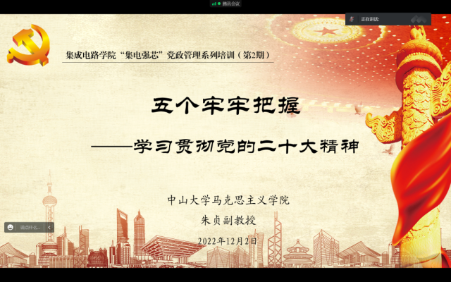 为深入学习贯彻党的二十大精神,深刻领悟“两个确立”的决定性意义,增强“四个意识”、坚定“四个自信”、做到“两个维护”,12月2日,永利yl23411直属党支部举办第二期“集电强芯”专题教育培训活动,邀请马克思主义学院朱贞副教授在线为全院师生讲解党的二十大精神,题目是“五个牢牢把握”。活动由李锦华副书记主持,学院全体师生参加了此次培训。