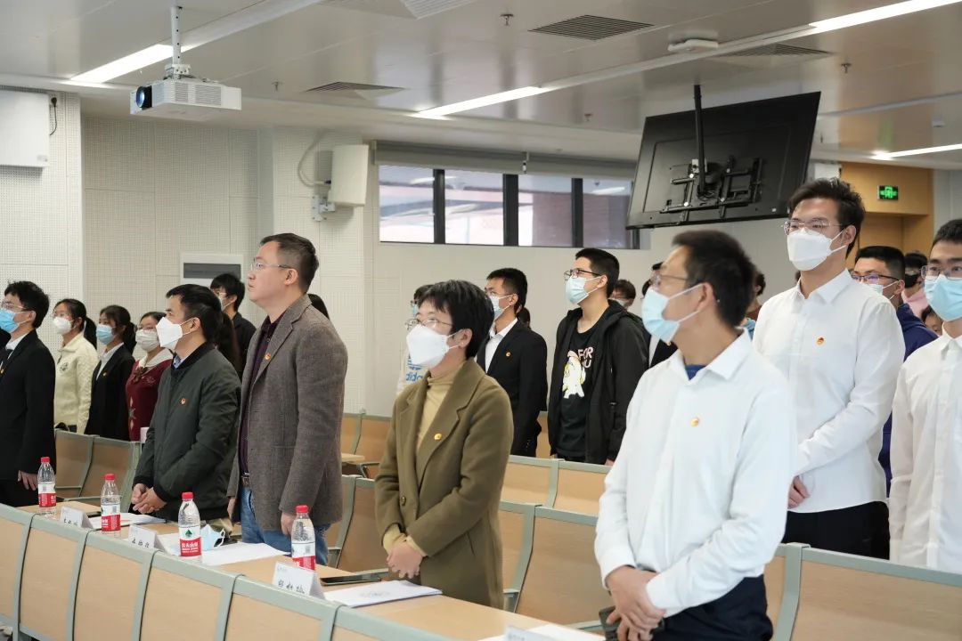 会议伊始,全体师生起立共同奏唱国歌和团歌。