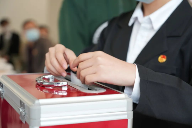 与会代表有序轮流上台投票,工作人员现场进行监票、计票工作。