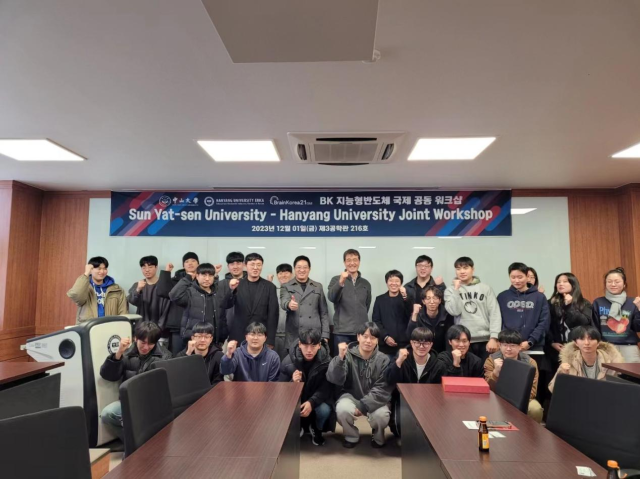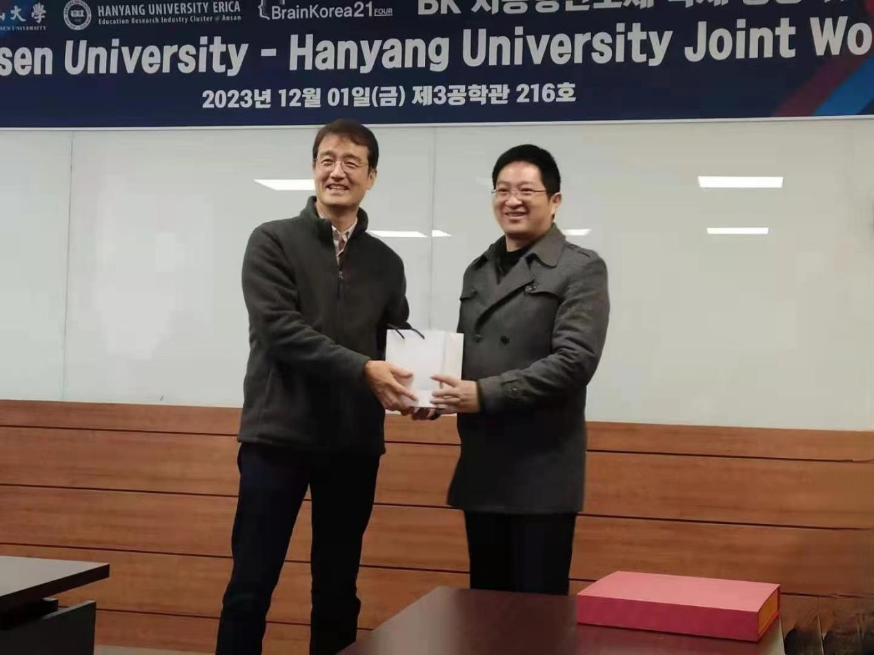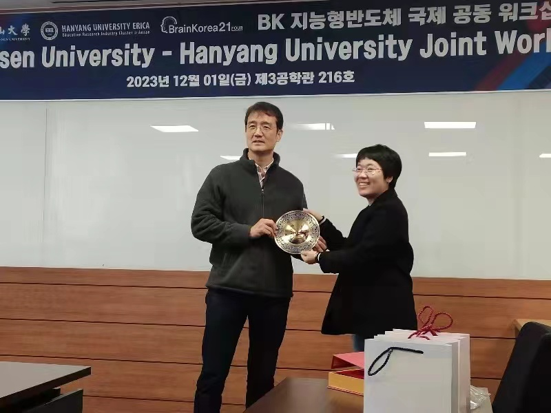 其次,学院一行还访问了韩国汉阳大学,会见了电子工程系主任Roh, Jeongjin教授,并与该系教授围绕集成电路领域构建学术交流与人才培养合作展开洽谈。同时,双方还进行了学术报告交流活动,通过线上、线下结合的方式,分享了来自韩国汉阳大学电子工程系三位教授,以及学院段权珍、幸新鹏两位副教授的学术报告。会后双方遵照公务礼节,互赠礼物,表达了深入合作的美好愿景。