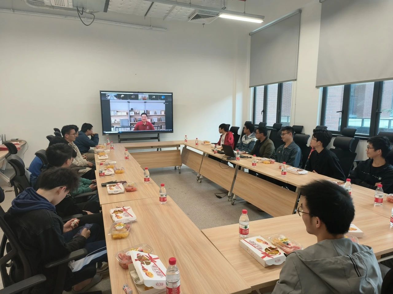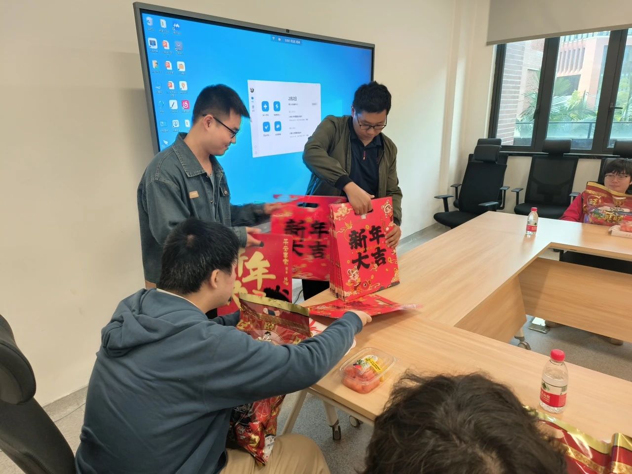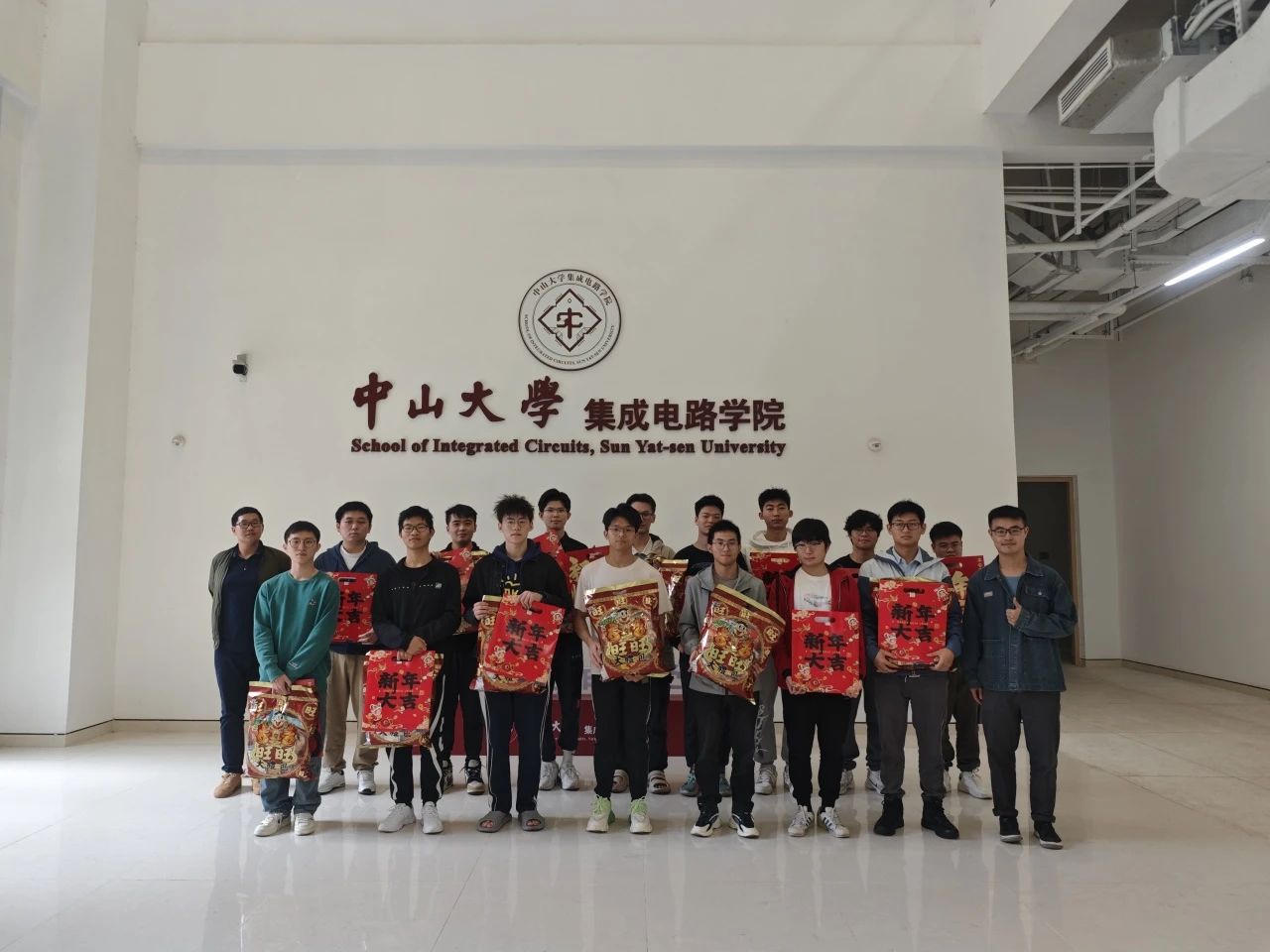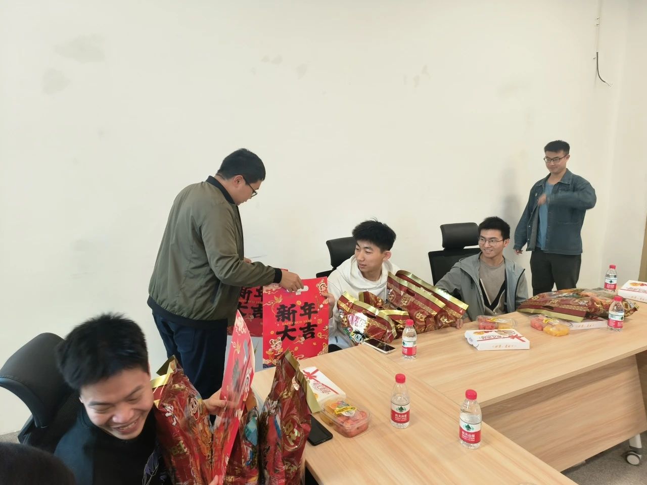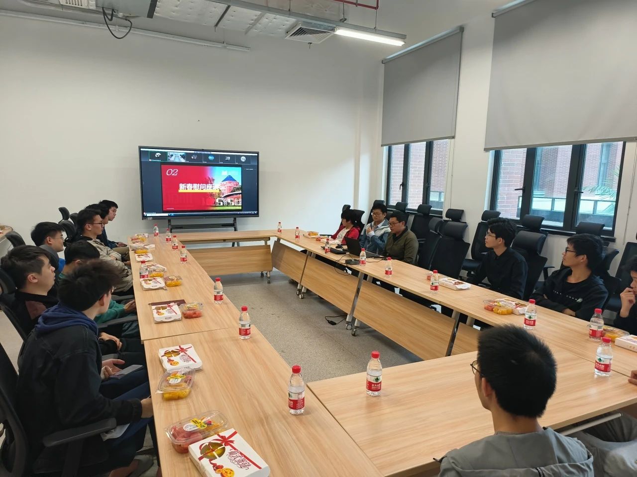 座谈会现场为同学们准备了水果和糕点,师生们亲切交谈,其乐融融。学院还为全体留校学生准备了新春大礼包和节日祝福,座谈会圆满结束,师生合影留念。