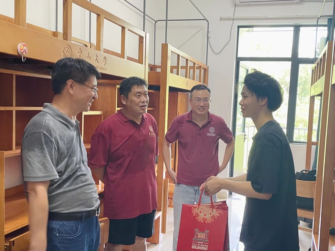 中山大学副校长邰忠智、校党委学生工作部部长靳祥鹏亲切看望了正在搬迁的同学们,并为同学们送上搬迁礼包,让同学们感受到学校的殷切关怀。学院也为每位同学送上解暑饮料。