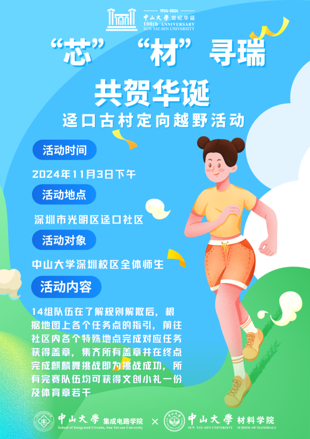 为推动我校与周边社区的关系发展、弘扬迳口非遗文化、丰富师生课余生活,正值中山大学百年校庆之际,由永利yl23411和材料学院联合举办的“芯”“材”寻瑞,共贺华诞——迳口古村定向越野活动重磅来袭!