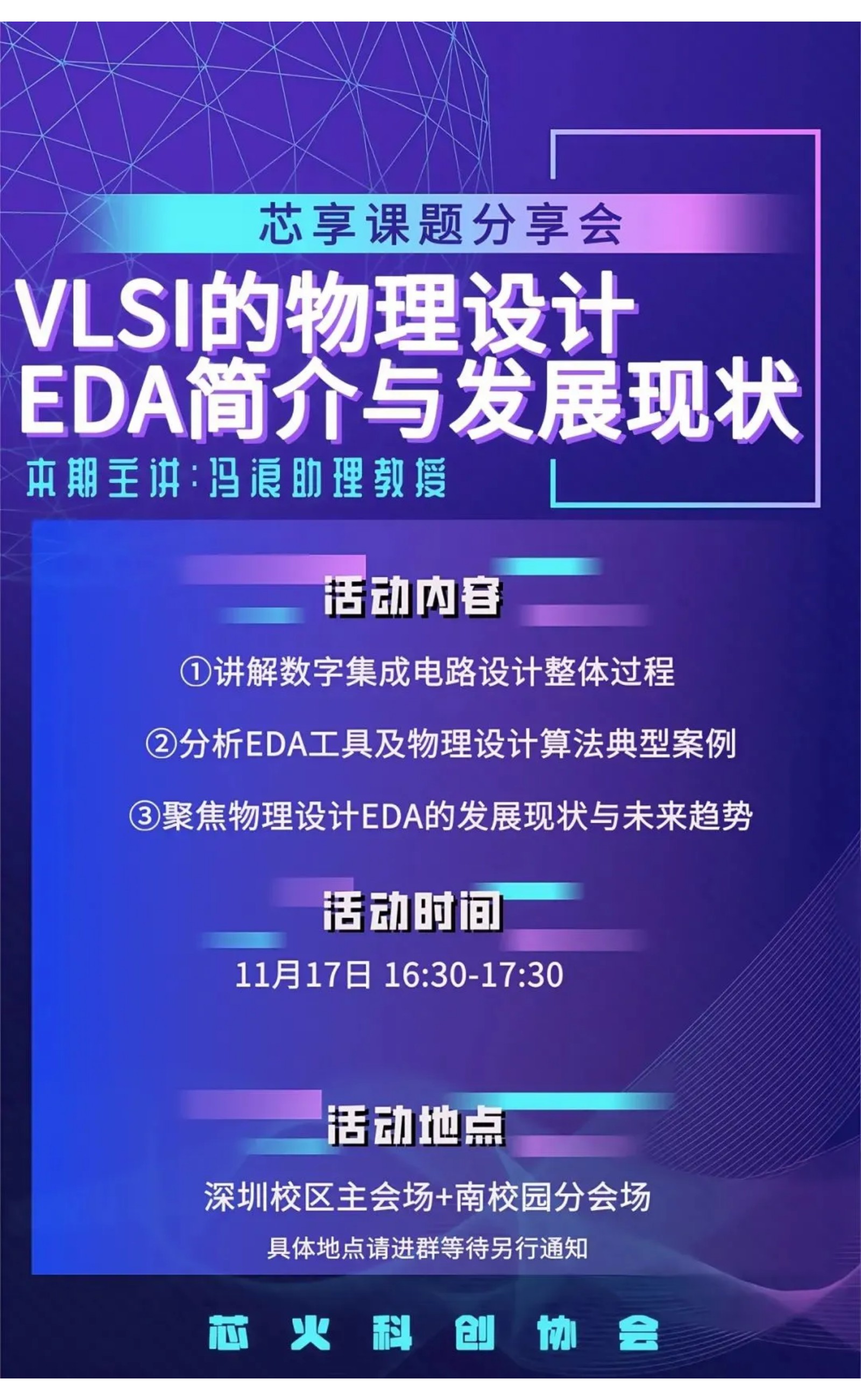 在永利yl23411党组织的带领下,“芯”青年成长训练营暨青马学堂已经正式启动。训练营将通过系列培养活动,提升学员的思想素质和实践能力,培养集成电路产业的青年骨干。在此背景下,由永利yl23411芯火科创协会主办的第一期“芯享”课题分享会即将开讲,特邀冯浪老师为大家带来主题分享:《VLSI的物理设计EDA简介与发展现状》。
