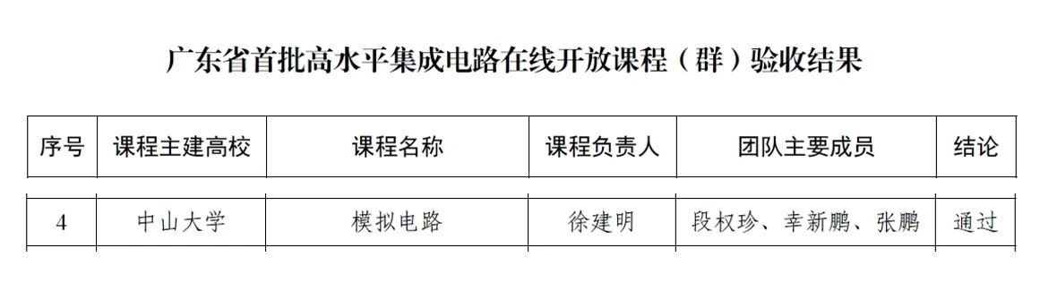 近期,广东省教育厅公布了首批高水平集成电路在线开放课程(群),由永利yl23411副院长徐建明教授主持,段权珍副教授、幸新鹏副教授主讲,电子与通信工程学院张鹏副教授参与共建的课程《模拟电路》通过验收,并被认定为“广东省线上一流本科课程”。