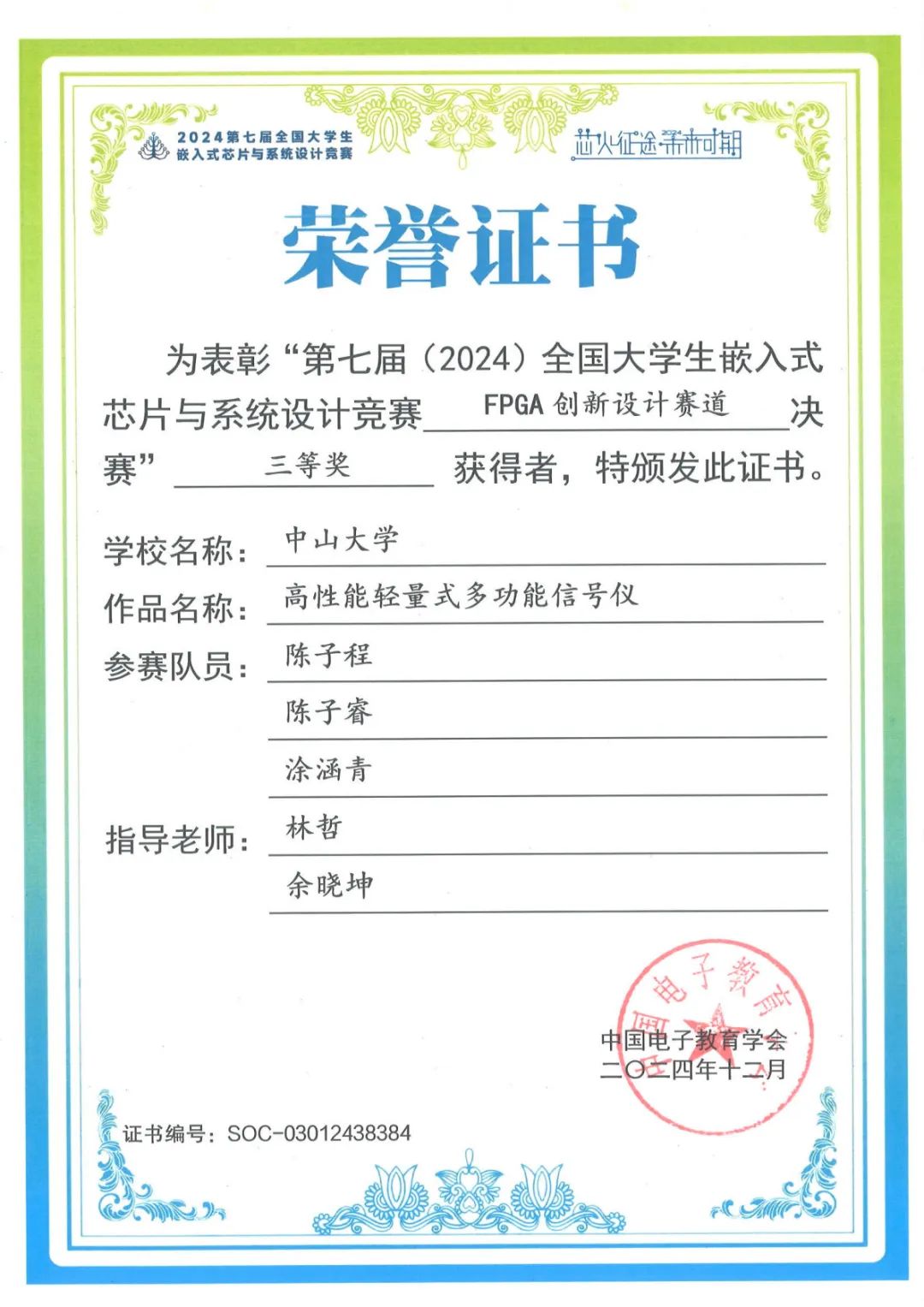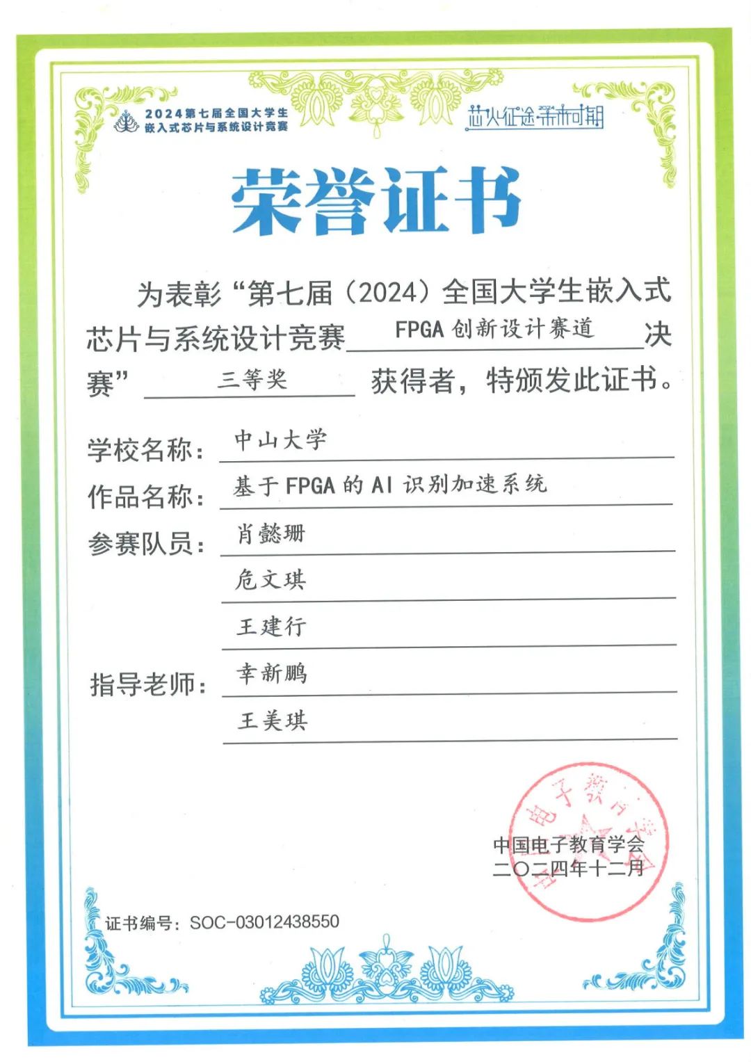 在FPGA创新设计赛道中,获奖的两支队伍分别是:林哲助理教授和余晓坤老师指导的陈子程、陈子睿和涂涵青团队;幸新鹏副教授和王美琪助理教授指导的肖懿珊、危文琪和王建行团队。这两支队伍在六千多支参赛队伍中突围而出,均斩获全国三等奖(中山大学共有六支获奖队伍,我院占据两席),充分体现了我院师生的创新实践能力和技术水平。