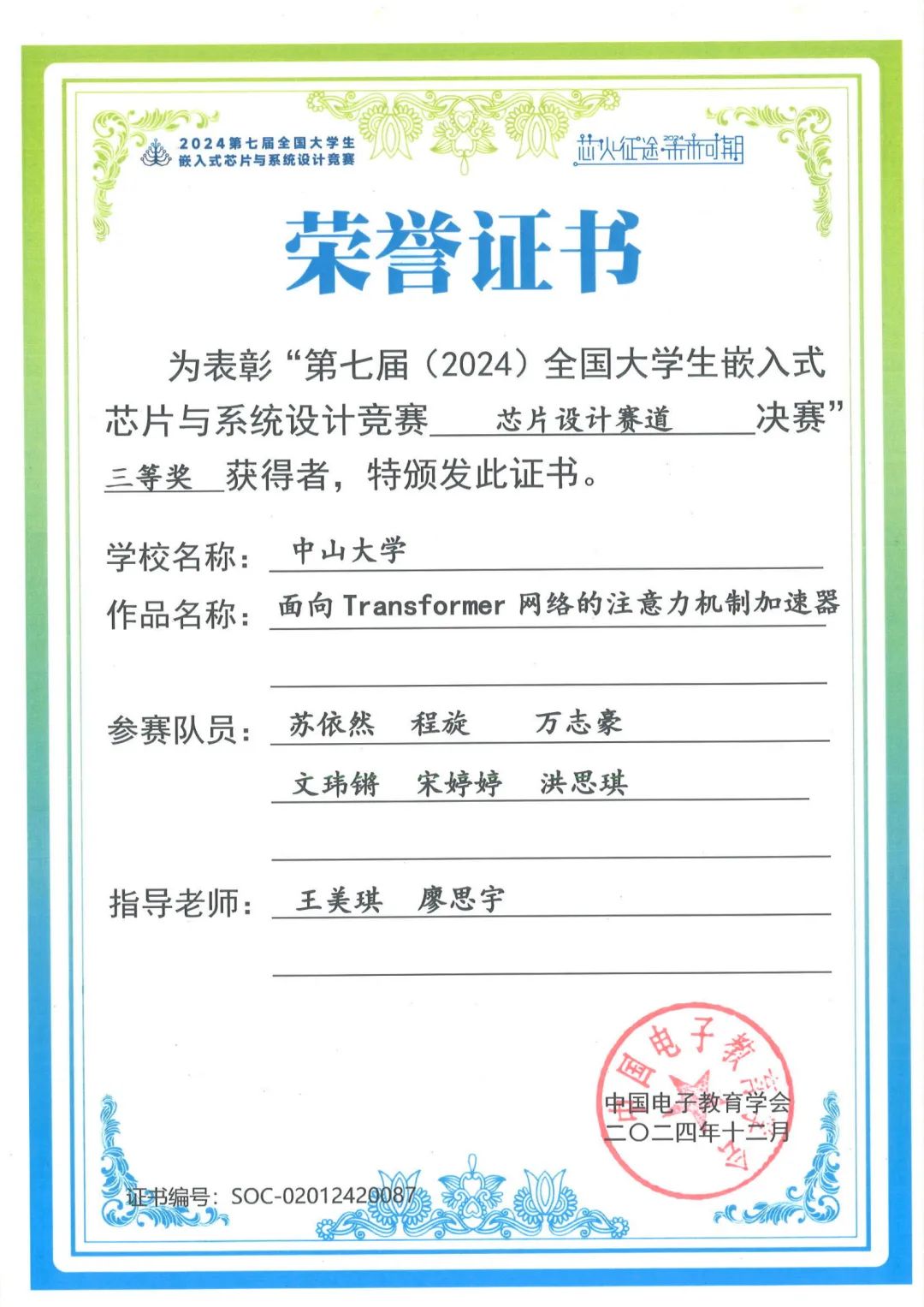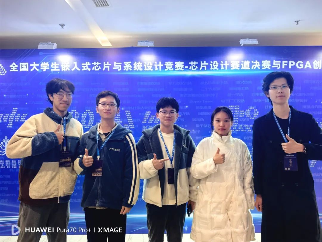 其中,由苏依然、程旋、万志豪、文玮锵、宋婷婷、洪思琪组成的团队,在廖思宇预聘助理教授和王美琪助理教授的指导下,从深圳远赴南京,首次挑战芯片设计赛道并荣获全国三等奖,也是中山大学在芯片设计赛道中唯一获奖的队伍。