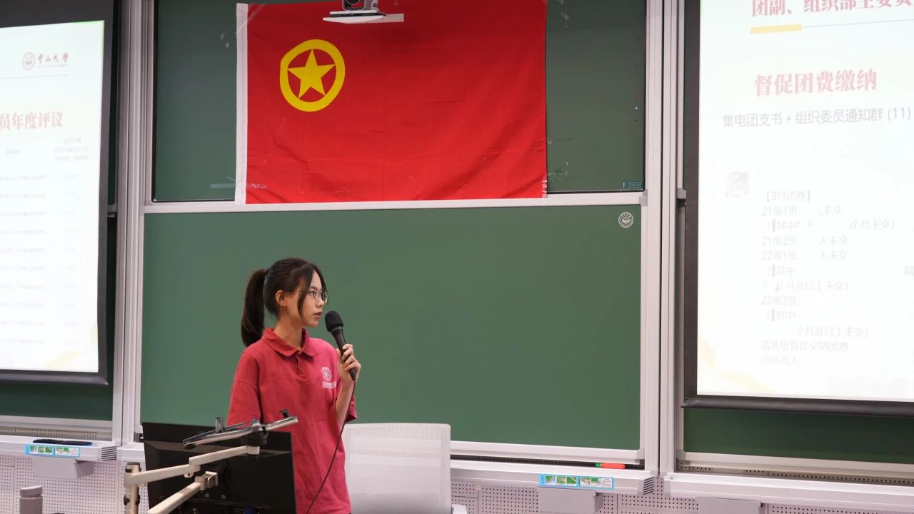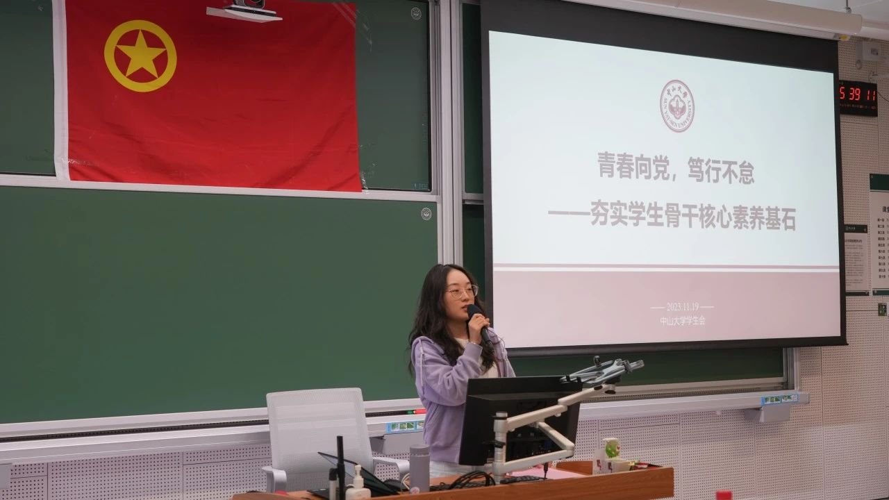 中山大学学生会优秀学生骨干张怡馨同学作经验分享。张同学为学员们讲解了学生会的定位,她强调了学生会“全心全意为同学服务”的初心,讲述了学生骨干应具有的各种能力,并希望学员们能够在学习中出色,在工作中出彩。