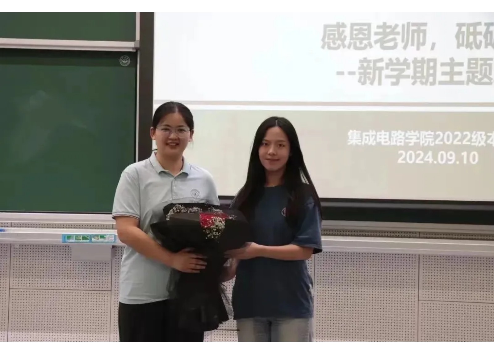 班会以“感恩老师,砥砺前行”为主题,首先向全体老师表达了教师节祝福。2022级班委组织同学们向两位老师送上鲜花,衷心感谢他们对学生工作的辛勤付出。
