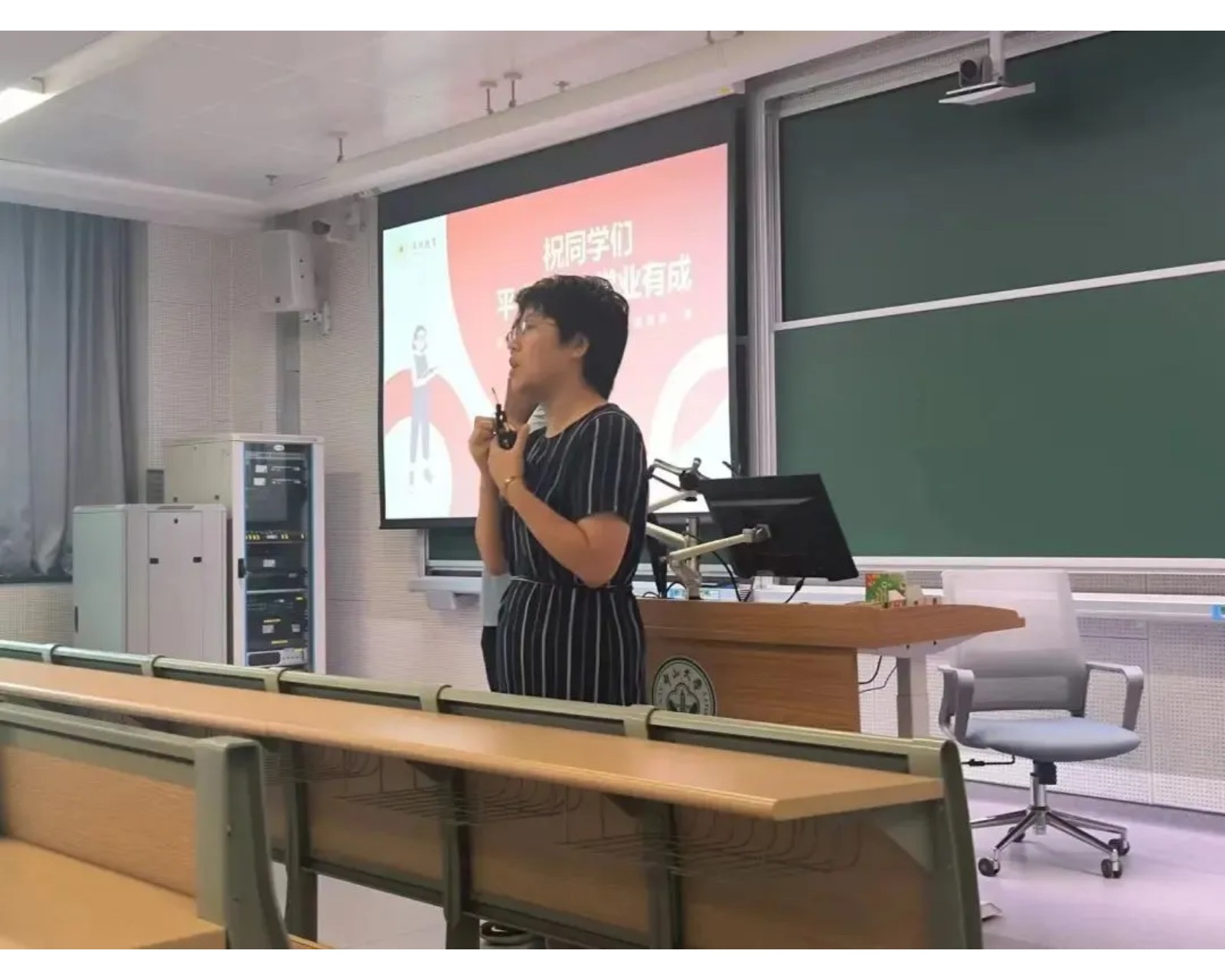 宋苏文老师发言。宋苏文老师首先强调了生活安全问题。随后,她针对同学们普遍关心的学业问题进行答疑解惑。同时,她向大家介绍了关于保研推免以及考研等一系列升学相关流程,鼓励大家在新学年继续努力,把握自我提升的机会,让同学们对新学期、新阶段的发展方向有了更为明确的认识。