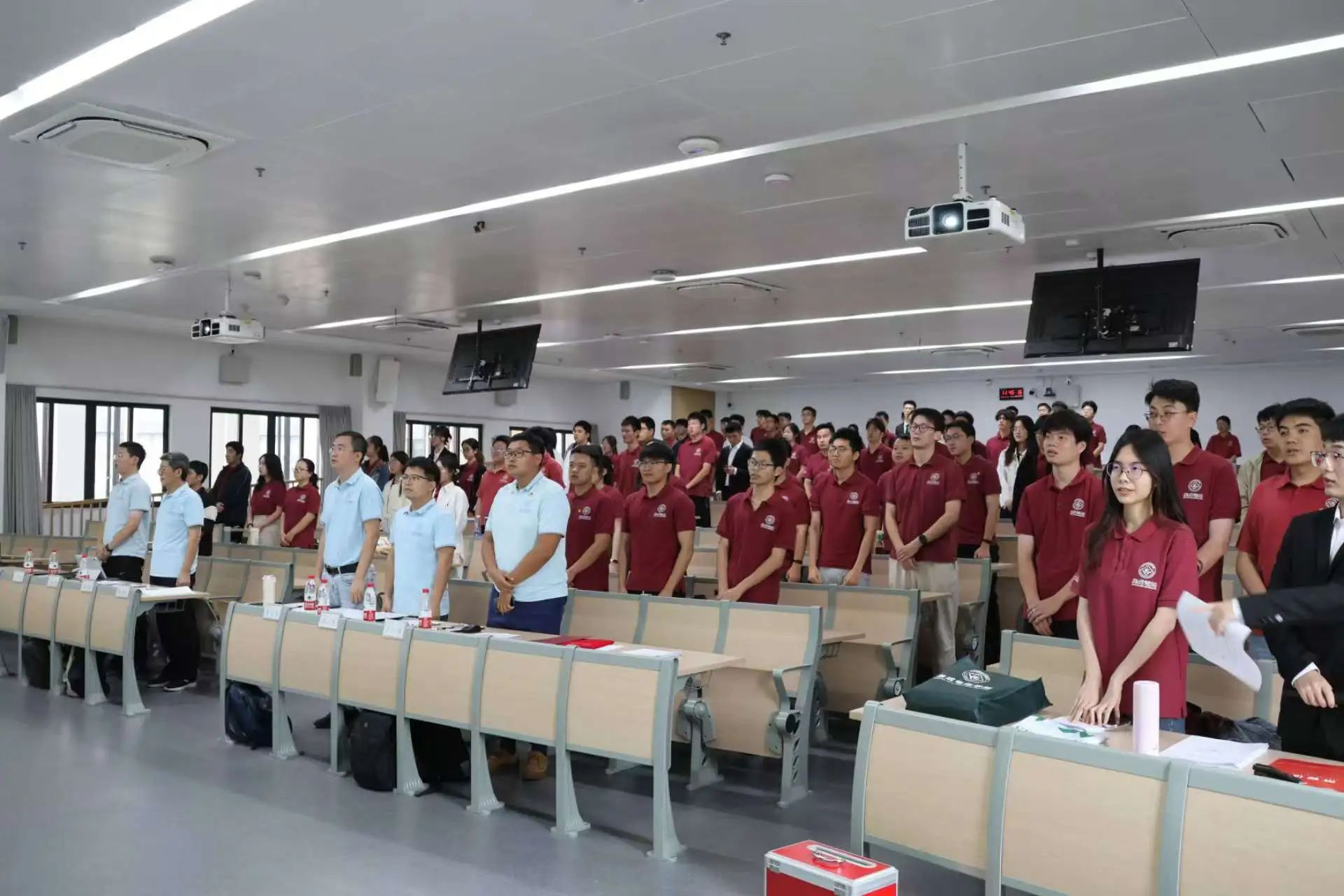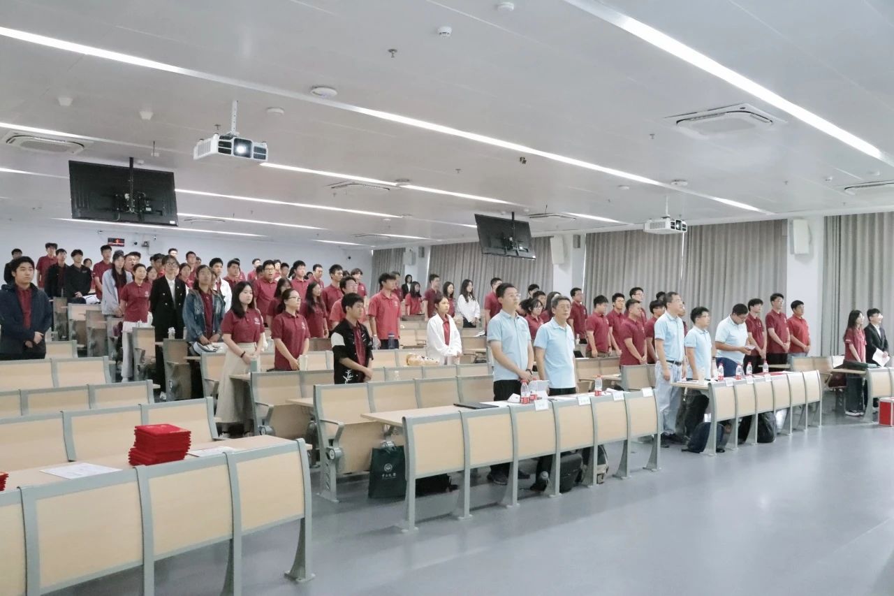 会议伊始,全体师生起立奏唱国歌和团歌。