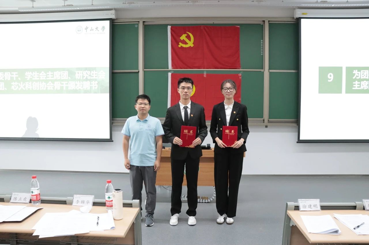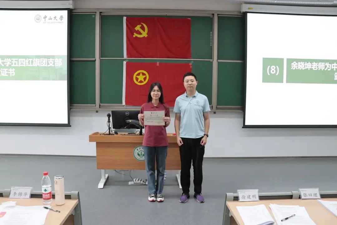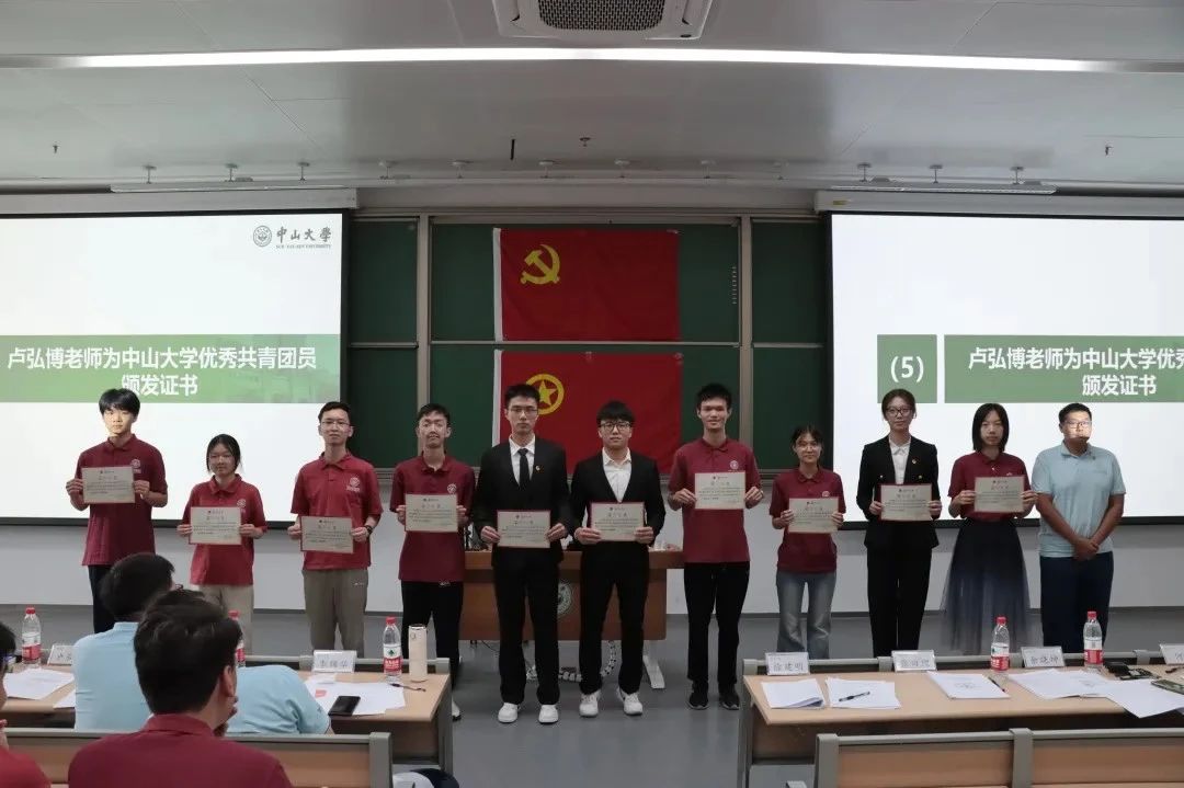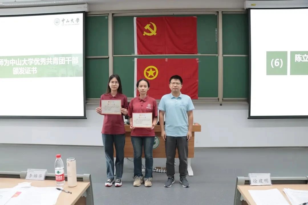 卢弘博老师、陈立虎老师、余晓坤老师分别为获评2023-2024学年中山大学优秀共青团员、优秀共青团干部、五四红旗团支部的同学及团支部颁发荣誉证书。
