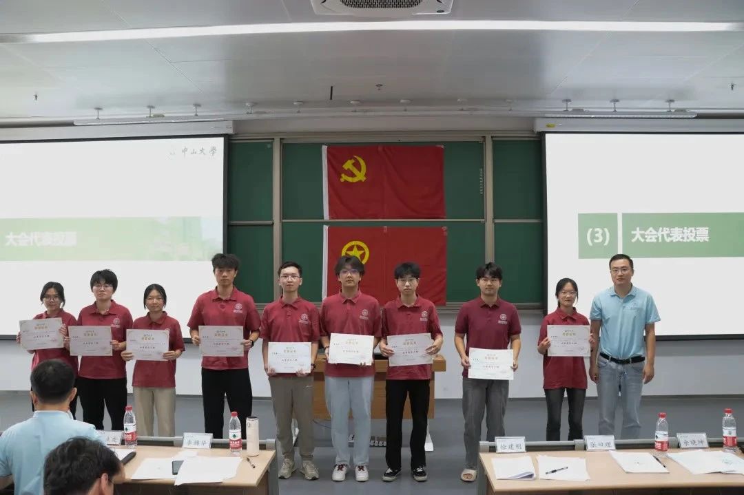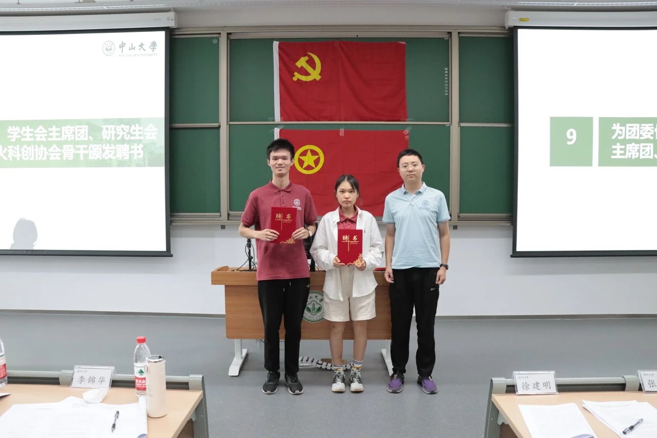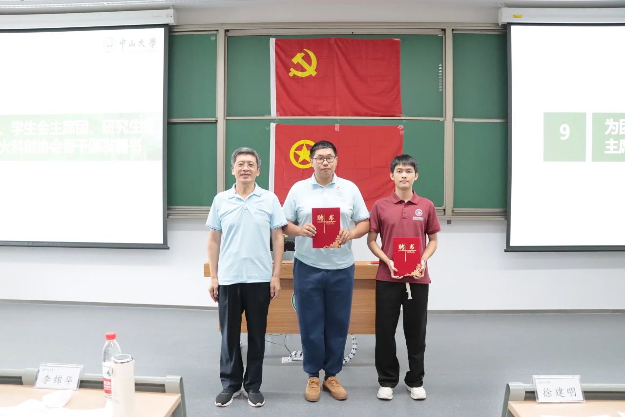 卢弘博老师、陈立虎老师、余晓坤老师分别为获评2023-2024学年中山大学优秀共青团员、优秀共青团干部、五四红旗团支部的同学及团支部颁发荣誉证书。