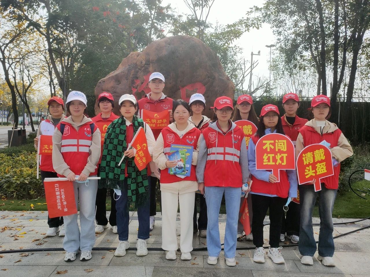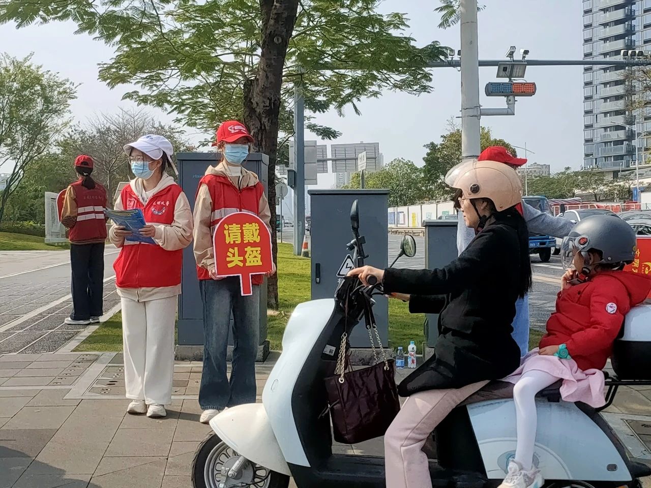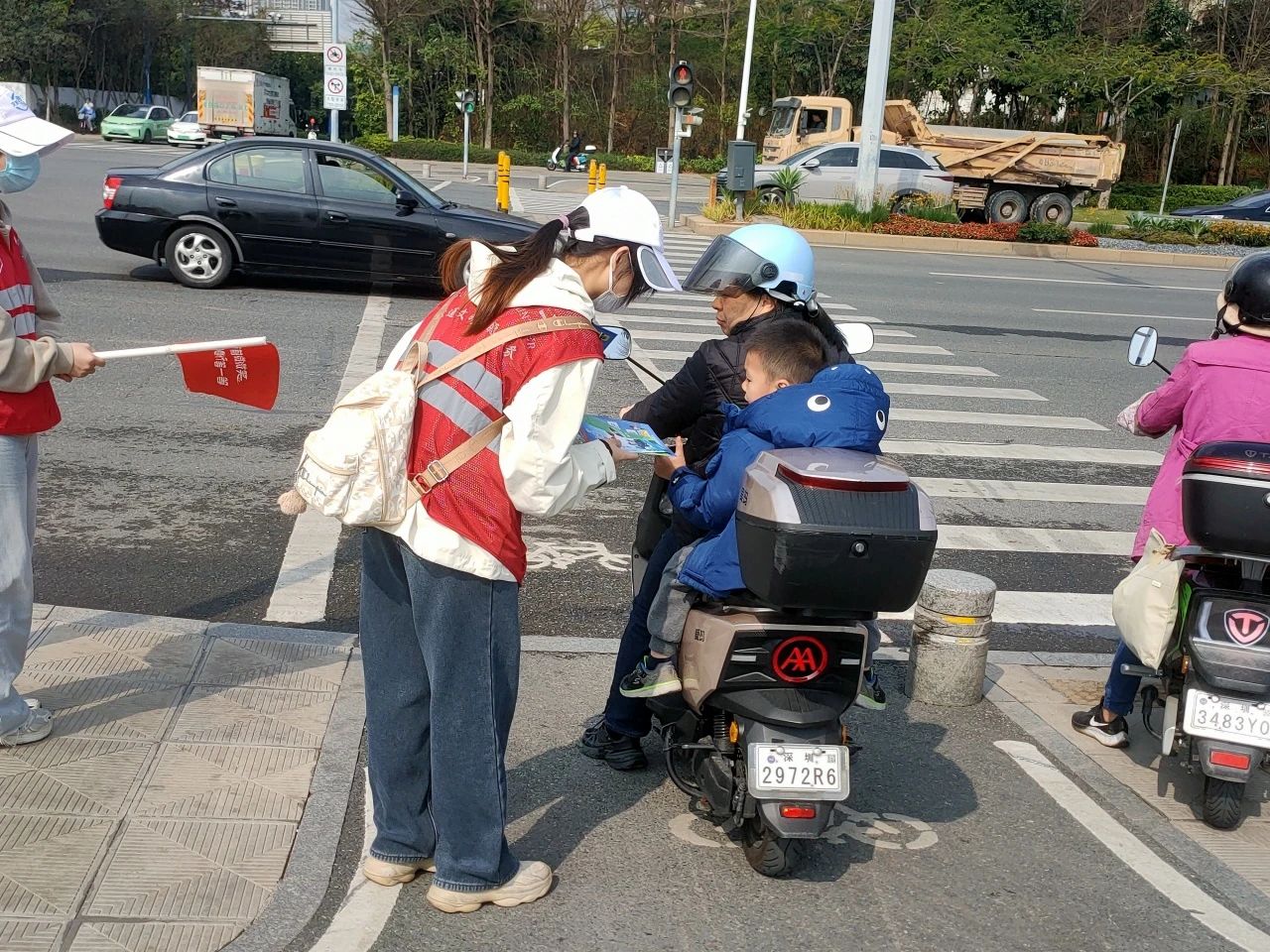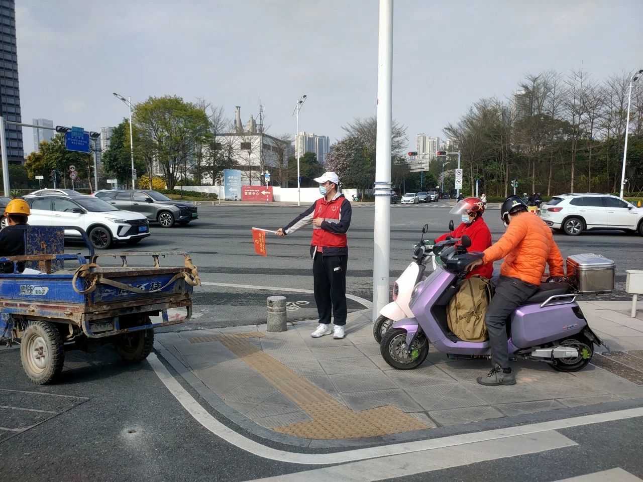 第二组志愿者们化身"文明交通守护者",身着义警服、手持指挥旗,驻守在人流密集的十字路口。他们通过举牌示意、旗语引导等方式,对行人闯红灯、非机动车逆行、骑行中不戴头盔等行为进行温柔劝导,并向过往市民发放《安全出行手册》及反光头盔贴。志愿者们用暖心服务织就城市交通"安全网",让文明出行成为流动的雷锋风景线。
