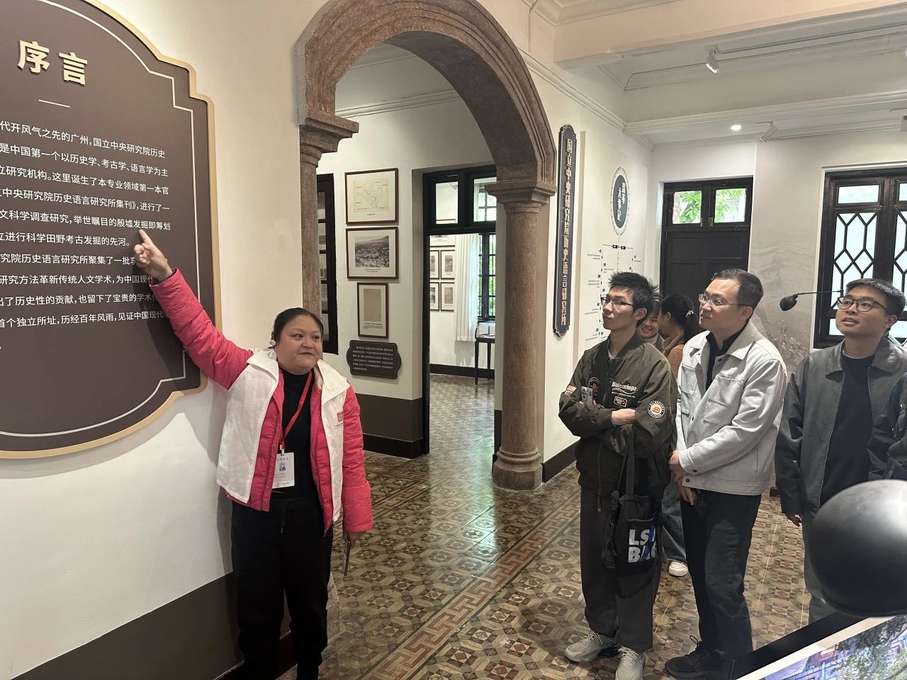 紧接着,讲解员带领师生们参观位于柏园二楼的史语所史料展览馆,详细介绍了史语所与中山大学的历史渊源。展览馆分为三部分:“无中生有的志业——历史语言研究所的创办” “动手动脚找东西——历史语言研究所初创时期的研究工作”和“如将不尽 与古为新——历史语言研究所旧址(柏园)的保护利用”,详细展示了史语所的创办历史,以及与中山大学在敦煌研究、考古学、民族学等领域的共同成果。史语所成立之初到如今,始终与中山大学的学术发展紧密绑定。柏园不仅是一座建筑,更是中大人坚守赓续文脉之行的见证者。师生们通过实地考察调研,在柏园的一砖一瓦间,探寻中大人文精神与柏园的交汇印记。