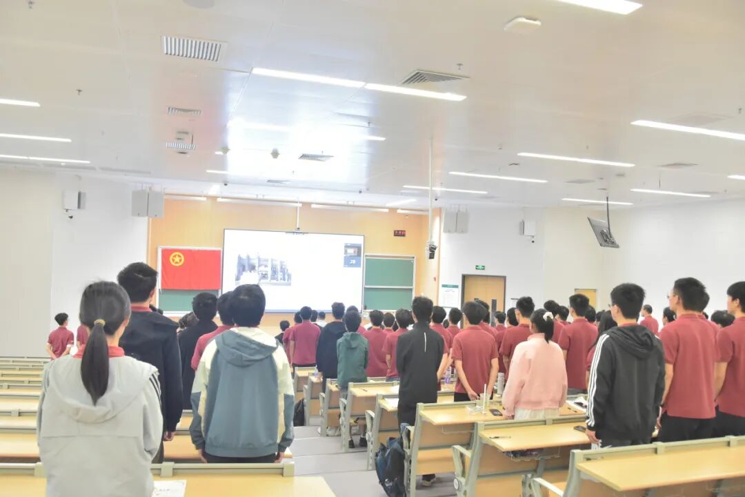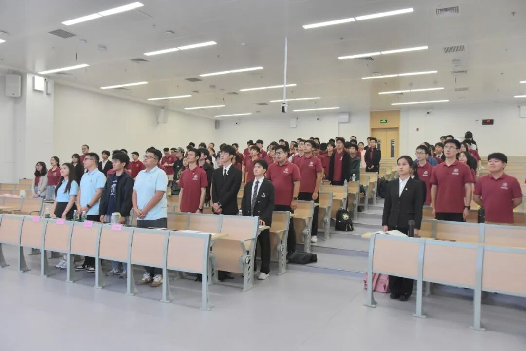 会议伊始,全体师生起立奏唱中华人民共和国国歌和中国共产主义青年团团歌。